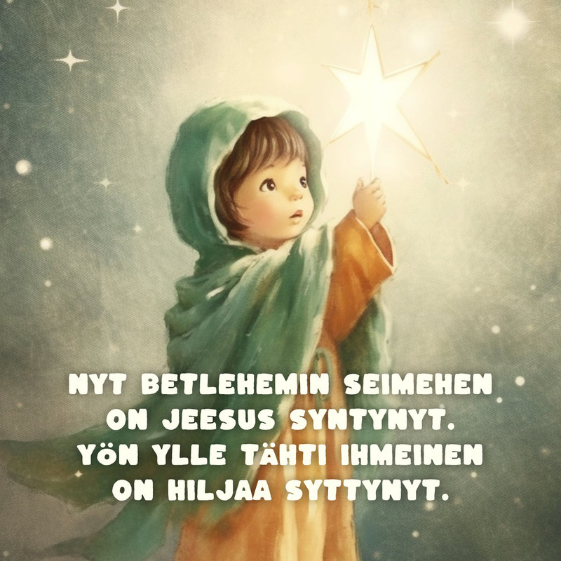 Nyt Betlehemin seimehen on Jeesus syntynyt. Yön ylle tähti ihmeinen on hiljaa syttynyt.