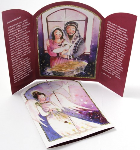 Kolmiosaisessa kortissa on Minna L. Immosen herkkä ja kaunis akvarelliteos Pyhä perhe. Jouluevankeliumin sisältävän kortin voi nostaa pystyyn jouluiseksi alttariksi ja pöytäsomisteeksi. Ihana kortti antaa ja saada. Hintaan sisältyy kirjekuori.