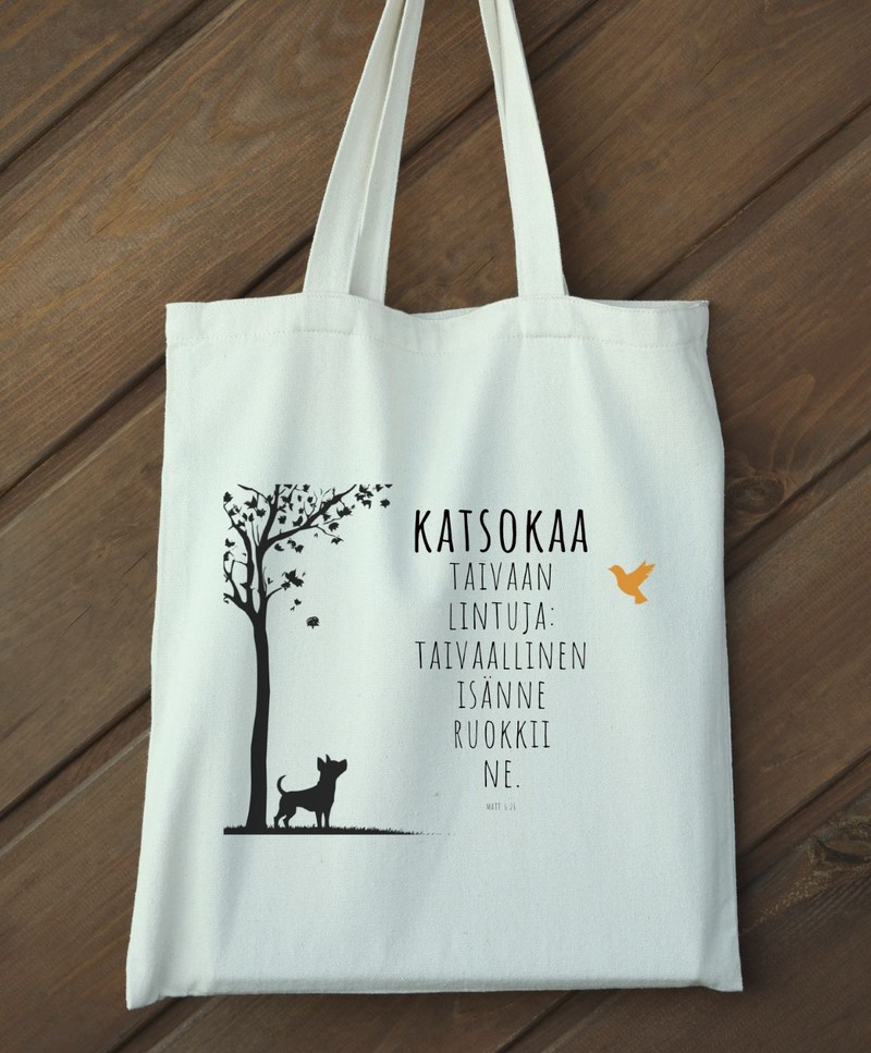 Kangaskassi Raamatun tekstillä. Tukeva kangas.