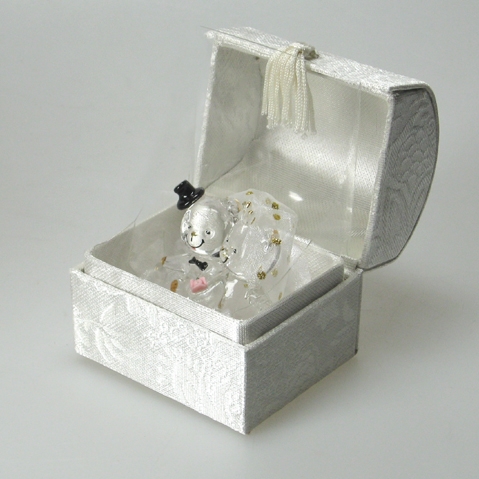 Lasinen 24k kultauksella koristeltu nalle-hääpari, joka on sijoitettu puuvilla-satiinilla päällystettyyn rasiaan.