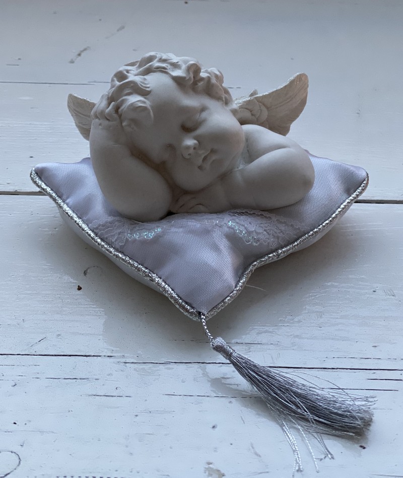 Perinteinen Rafaelin enkeli tyynyn päällä. Tyyny on satiinia, enkelin valmistusmateriaali on resin.
