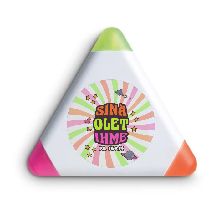 Itselle tai lahjaksi hauska ja käytännöllinen kolmionmuotoinen korostuskynäsetti, jossa kolme eri väristä korostuskynäpäätä (keltainen, fuksia ja oranssi) samassa kauniissa paketissa. Sopii hyvin myös vaikkapa pikkujoulupussukkaan tai leiripalkinnoksi.