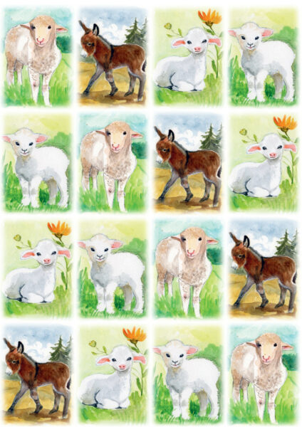 Tarra-arkki Lammaskatras ja aasi. Hellyttäviä villapalleroisia ja pitkät korvat.